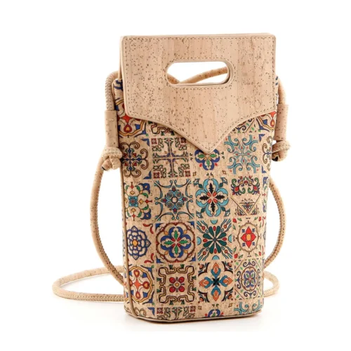 Portuguese Azulejo Cork Phone Bag - Vegan Crossbody Pouch with Cord Strap