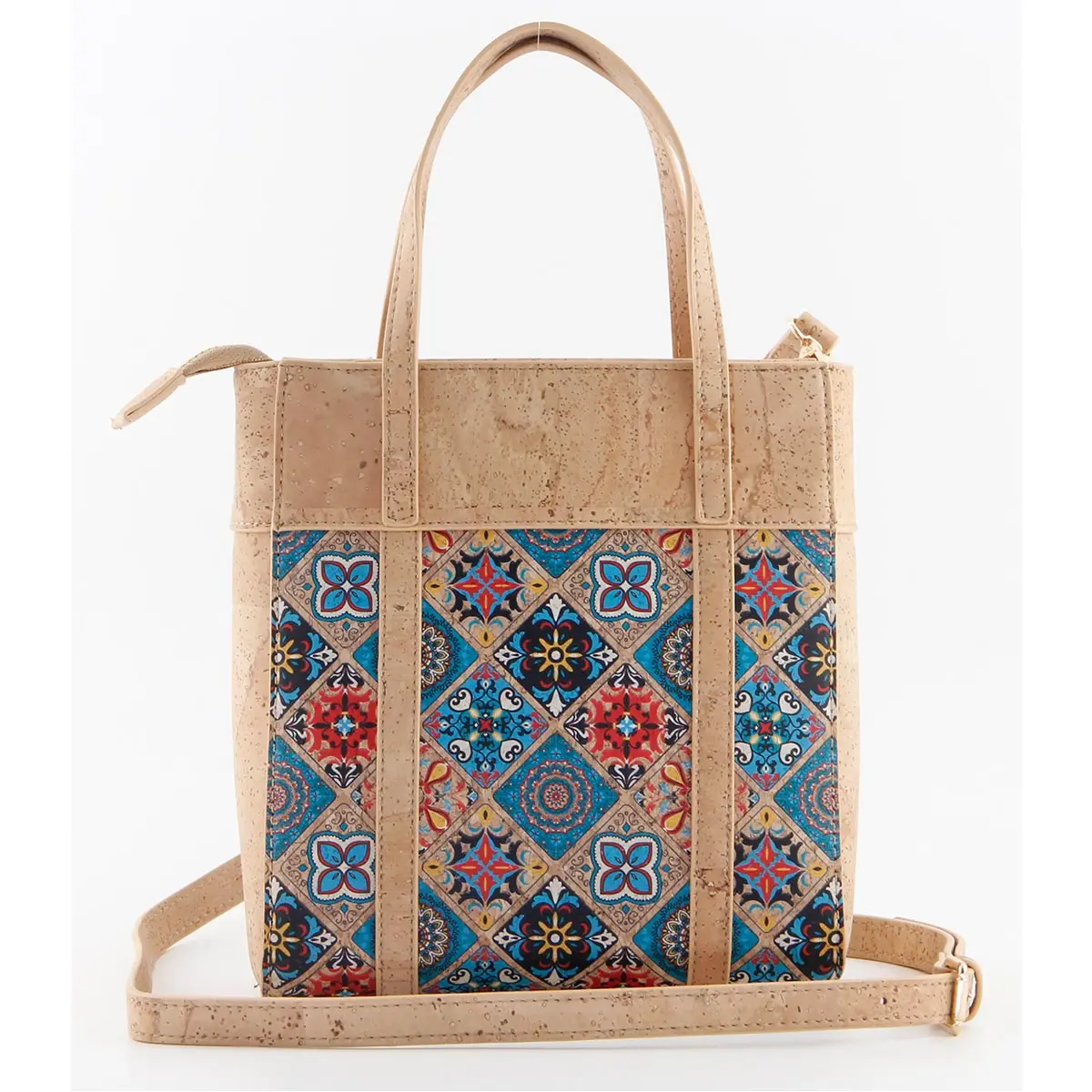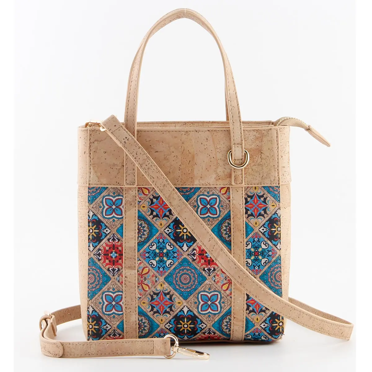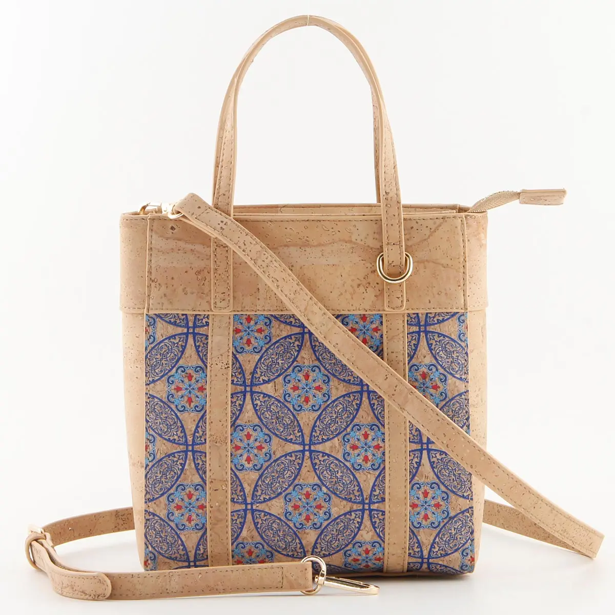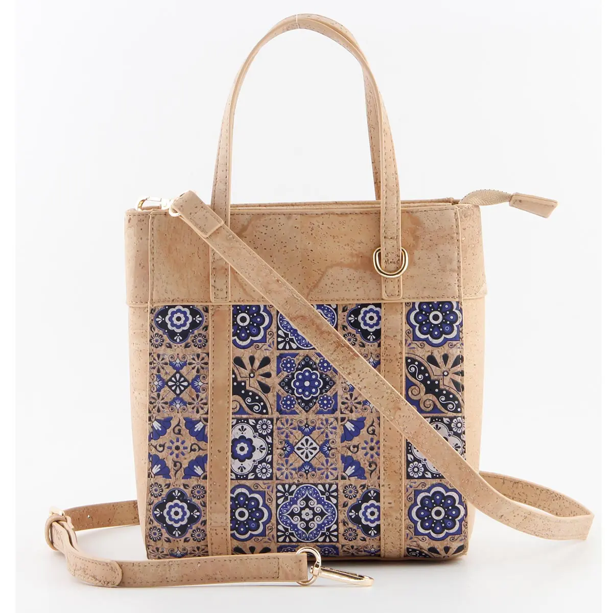 Portuguese Azulejo Cork Crossbody Tote – Small Vertical Vegan Shoulder Bag