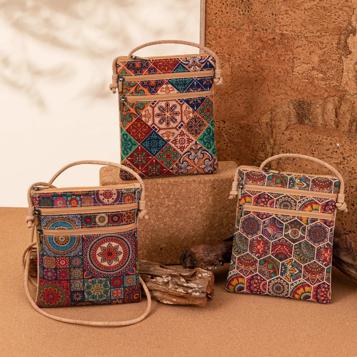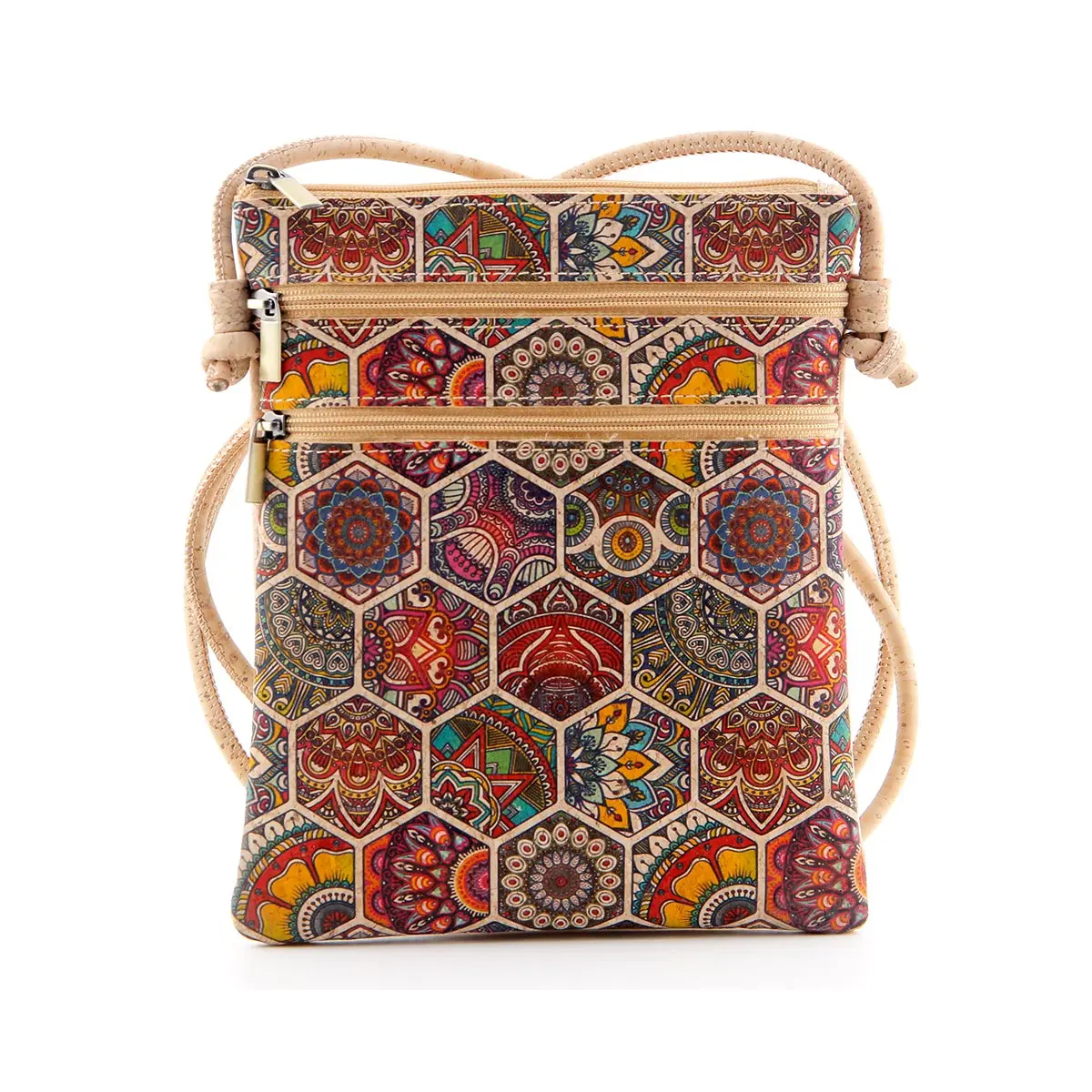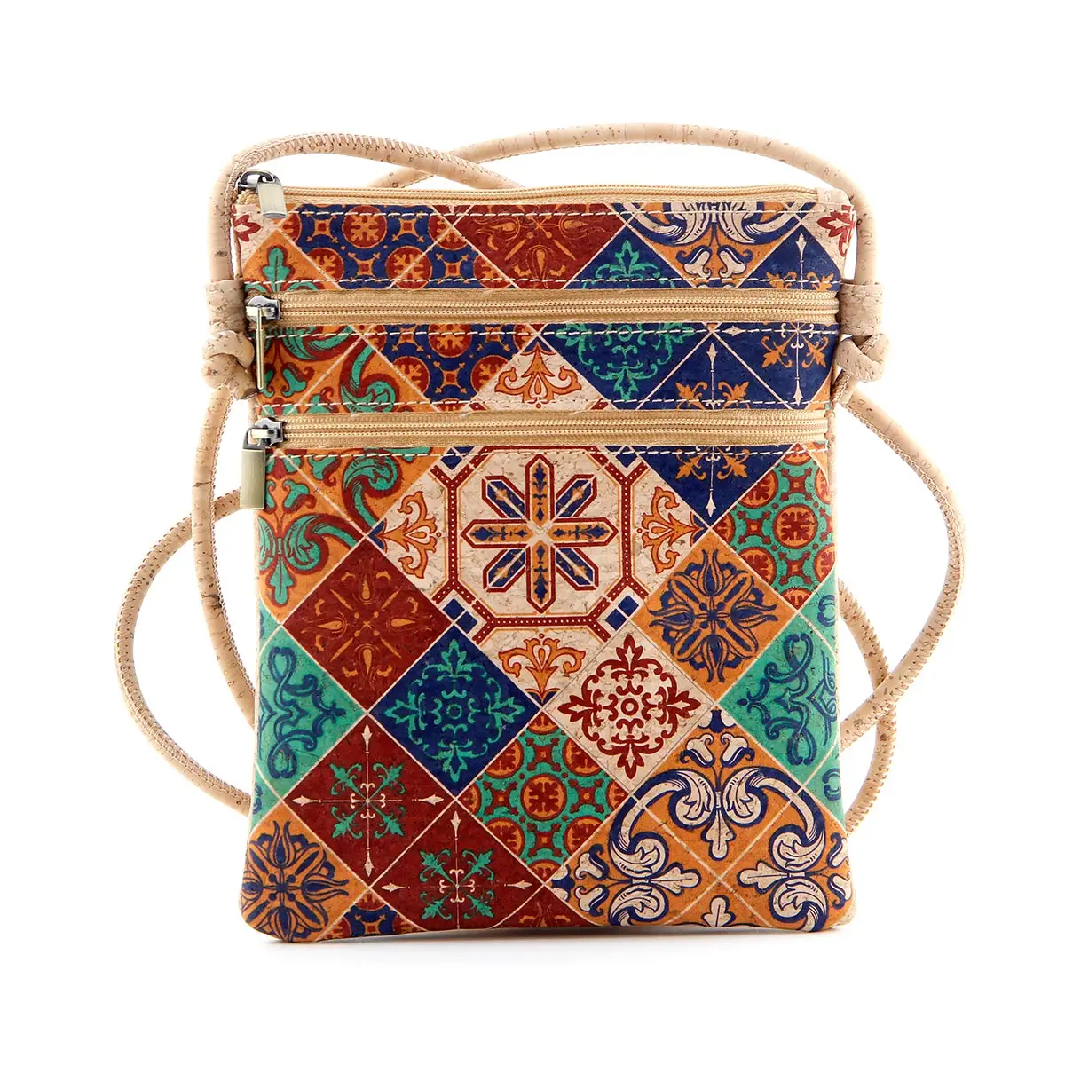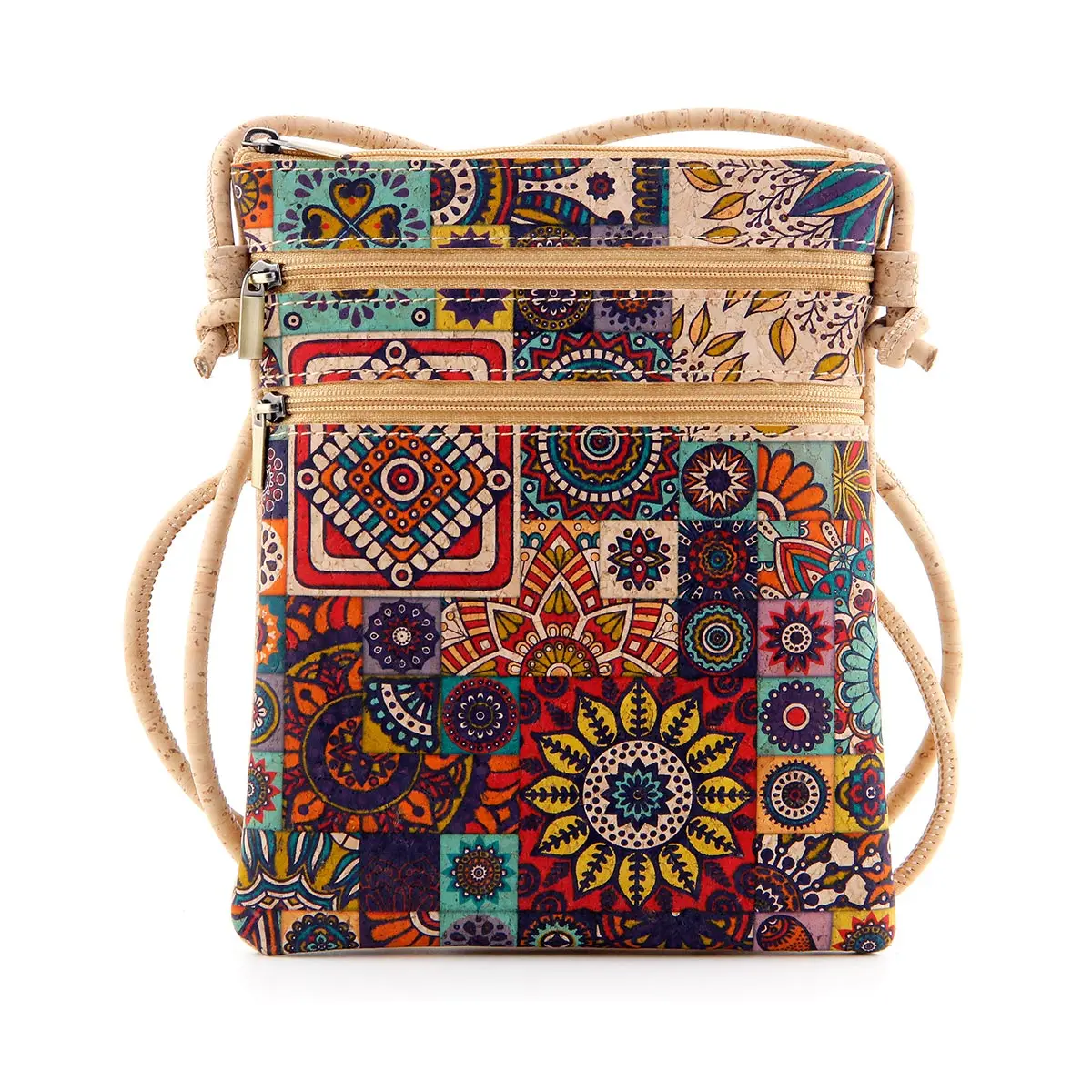 Small Cork Crossbody Bag for Cell Phone – Vegan Shoulder Purse with 3 Zipper Pockets – Ethnic Mandala & Azulejo Print